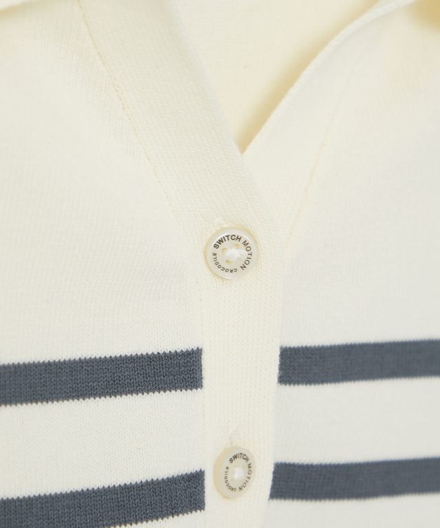 表は綿、裏はポリエステル糸編みで仕上げたパネルボーダーニット。袖口のロゴプリントがさりげないアクセントに。カットソーと合わせたレイヤードスタイルがおすすめです。