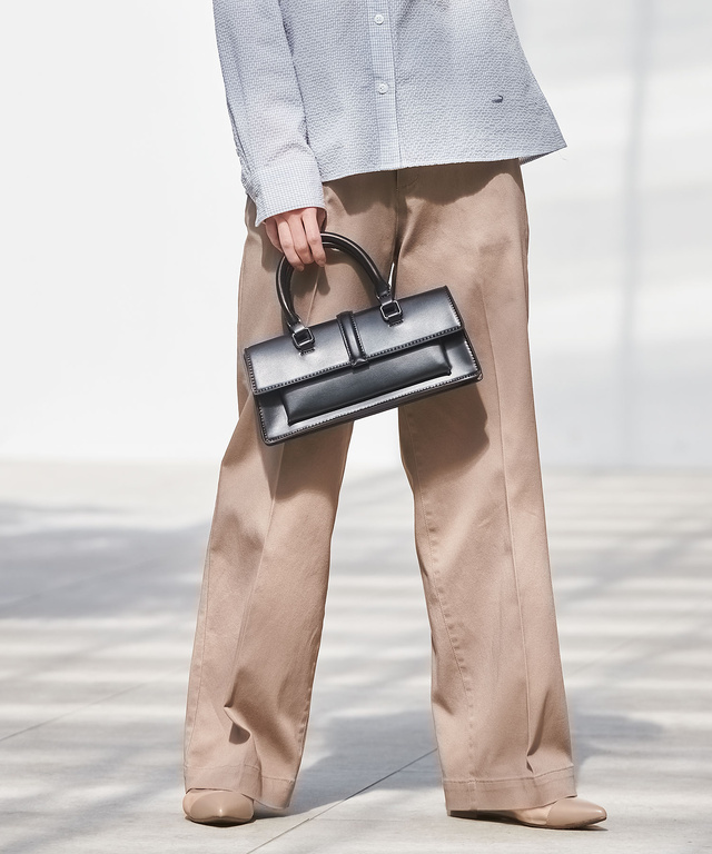 上品な光沢感のあるサテン生地のセミワイドパンツ。キレイめな素材ながらカジュアルスタイルにも合わせやすいシルエットで、シーズンレスに着まわしやすいアイテムです。