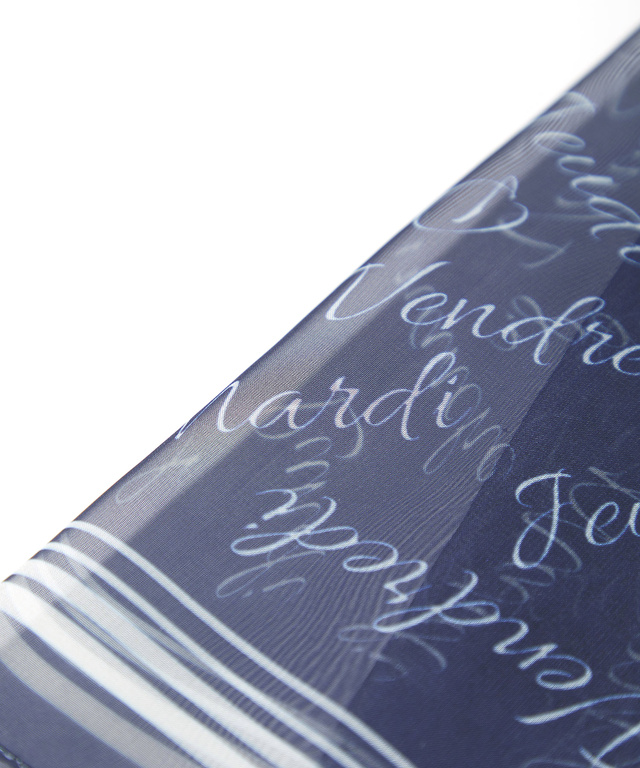 フランス語で曜日をプリントしたポリエステル素材のスカーフ。夏らしいシフォン素材でバッグなどに巻いてもアクセントになります。