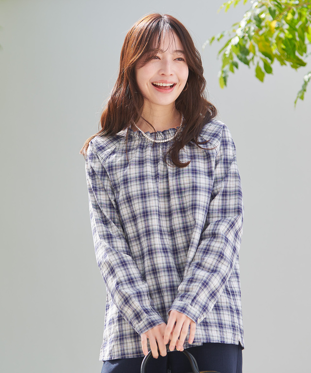 ニットやアウターのインナー着としても1枚着としても活躍する、襟のギャザーがポイントのラグランスリーブブラウス。トラッドなチェックとストライプの2柄展開です。