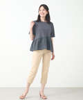 裾部分に同系色の布帛素材を使用したデザインTシャツ。斜めの切り替えラインが自然と腰の位置を高く見せてくれるため、体型をさりげなくカバーしながら、着るだけでバランスよく見えます。肌ざわりもよく、1枚で着映えするので、暑い季節のおしゃれ着として重宝します。