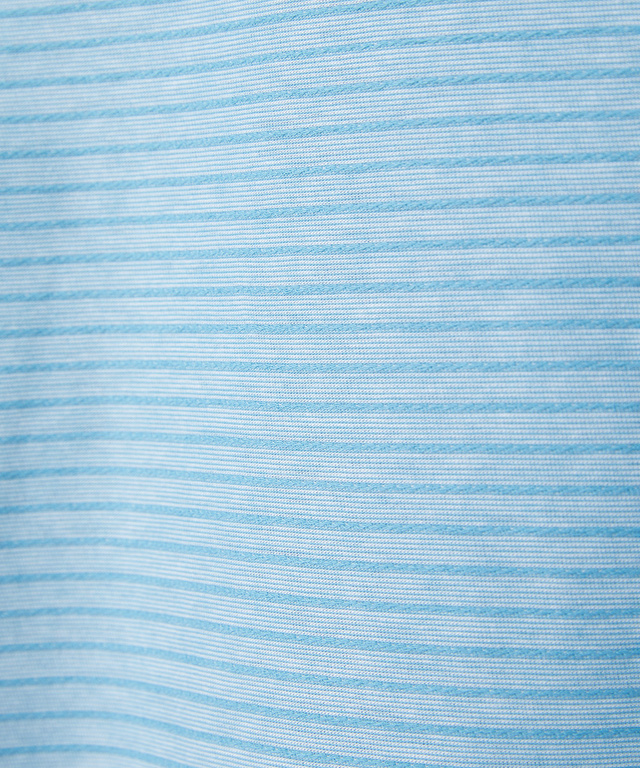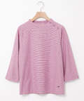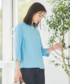 細かいボーダー状の縄柄ジャガード生地を使用したプルオーバーカットソー。ハイネックデザインですが、アシンメトリーの開きになっているので着脱が簡単です。夏らしい色展開にしていますが、細かいボーダー柄にしているので色の見え方が和らぎ着回ししやすいアイテムです。